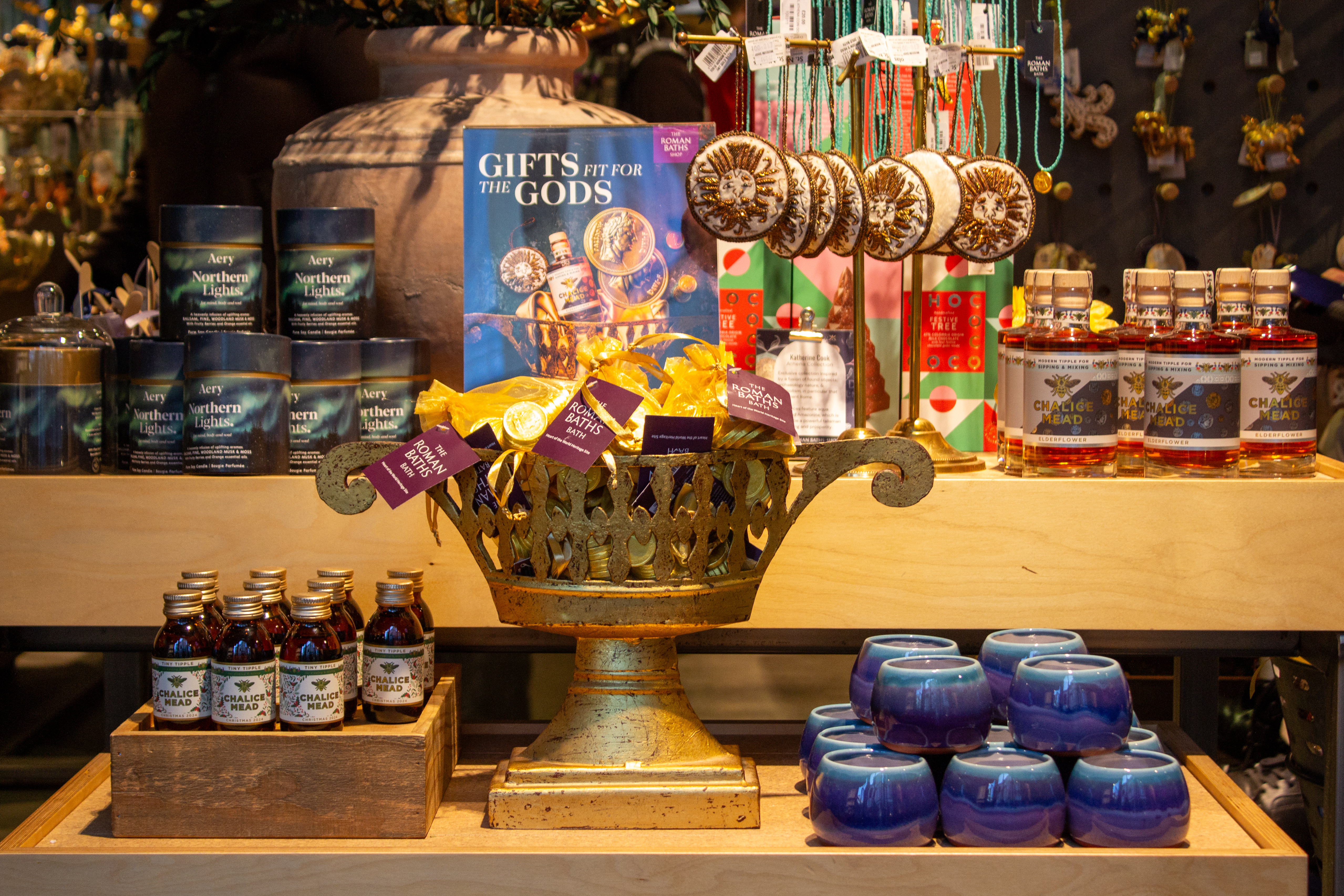 The Roman Baths Shop is brimming with seasonal gifts inspired by Bath’s ancient heritage – from honey mead and golden chocolate coins to spa treats, artisan homewares, and gemstone jewellery.